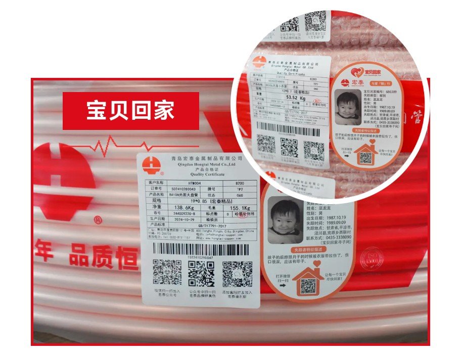 宏泰在銅管產(chǎn)品包裝上添加“寶貝回家”公益廣告,上面有兒童信息、官網(wǎng)二維碼和簡(jiǎn)短宣傳語(yǔ),讓產(chǎn)品成為流動(dòng)的宣傳媒介。
