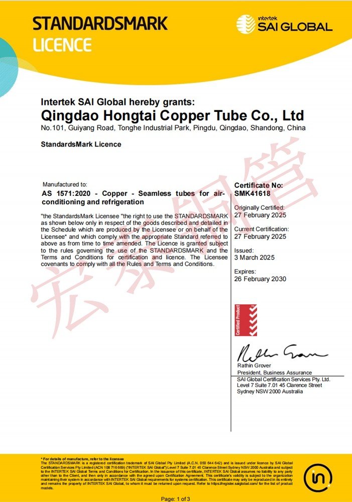宏泰銅管產(chǎn)品順利通過(guò)AS 1571無(wú)縫制冷用銅管標(biāo)準(zhǔn)認(rèn)證【證書編號(hào):SMK41618】和AS 1432給排水銅管標(biāo)準(zhǔn)認(rèn)證【證書編號(hào):WMK26832】。