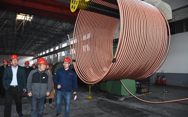 參觀團(tuán)在生產(chǎn)經(jīng)理帶領(lǐng)下來(lái)到銅業(yè)公司生產(chǎn)車(chē)間,詳細(xì)聽(tīng)取和了解宏泰連鑄連軋自動(dòng)化銅管生產(chǎn)工藝,針對(duì)生產(chǎn)管理提出了寶貴的建議和意見(jiàn)。