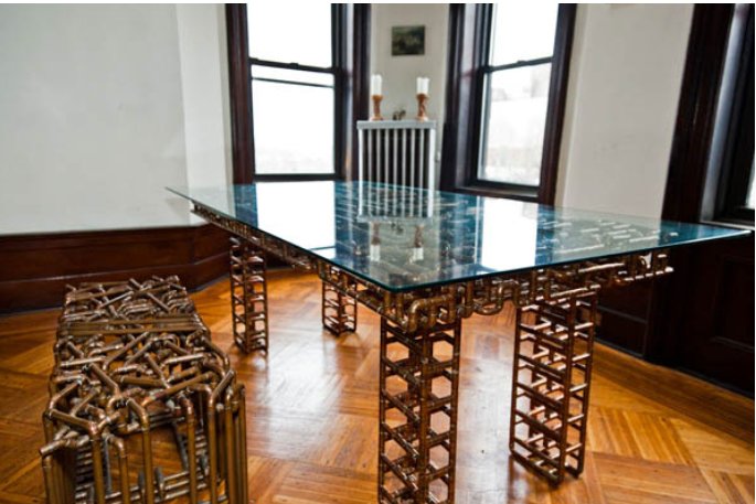 以上圖片所用到的銅管為硬態(tài),用擠壓法所成型,接口處用銅管件連接,主要使用三通管件和90度彎銅接頭,使用焊接的方式連接到一起,外表自然氧化,用切割工具將銅管切割成數(shù)段,按照自己的設(shè)計拼接到一起,巧妙的運用間架結(jié)構(gòu),堅固、美觀、實用,筆者認(rèn)為,這種銅管制成的桌子宜放在寬敞一些的客廳,窄小的客廳難以彰顯其大氣,并且最好能讓陽光射到,在光線的反射中細細欣賞,燃一支煙,尋找曾經(jīng)經(jīng)歷的崢嶸歲月,任煙霧裊裊,在銅管的光亮下沉入浮想,如此境界,堪稱之絕。